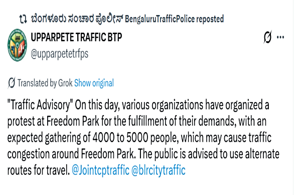 According to Bengaluru Traffic Police, on this day, various organizations have organized a protest at Freedom Park for the fulfillment of their demands, with an expected gathering of 4000 to 5000 people, which may cause traffic congestion around Freedom Park. The public is advised to use alternate routes for travel.