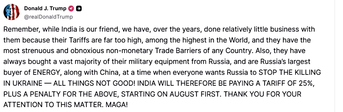 Following his statement on July 30th, Trump had already imposed a 25% tariff on India, and said, "plus a penalty for the above, starting on August 1st."