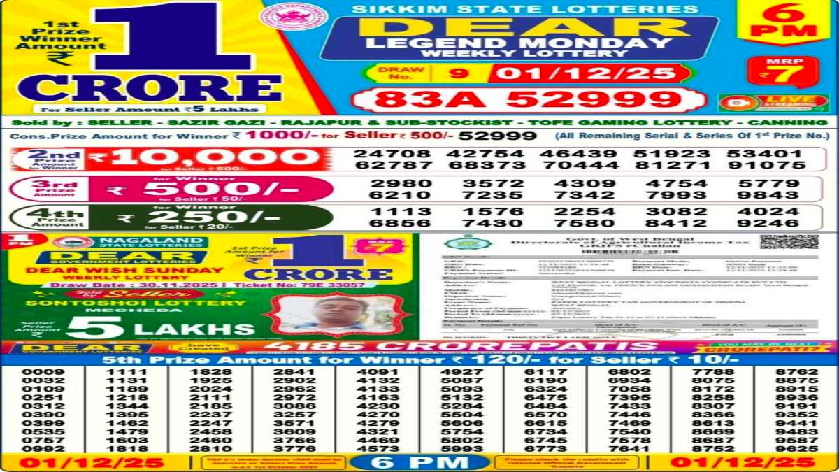 Nagaland State Lottery results for Monday, 1 December 2025, have been officially announced today, offering excitement for lottery participants across the state. The Dear Dwarka Morning draw was declared at 1 PM, followed by the Dear Blitzen Evening draw at 6 PM, and the Dear Finch Night draw at 8 PM. Each of these lotteries features a lucrative first prize of Rs 1 crore, making them highly anticipated by players eager to check their winning numbers.