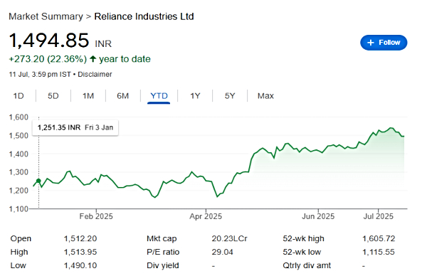 Last week, on Friday, Reliance stock closed at Rs 1494.85 apiece on BSE, down by 1.5% with a market cap of Rs 20,22,901.67 crore. On the current valuation, Reliance is still the largest company in India. From July 7th to July 11th trading session, Reliance stock dropped by 2.5%. However, in a month, the stock has gained by 4.7%.
