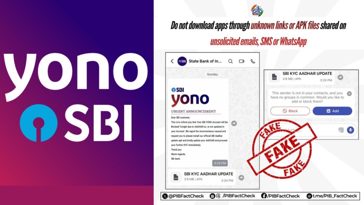 The message looks like an official alert and even uses the SBI logo and "SBI YONO" branding, but the government's PIB Fact Check unit has now confirmed that this claim is completely fake. SBI never asks its customers to update KYC or Aadhaar through unauthorised links or third-party APK files.