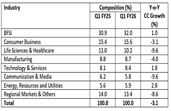 In percentage terms, BFSI revenue growth rose to 32%, an expansion of over 100 basis points from revenue growth of 30.9% in Q1FY25. However, revenue growth dipped by 3.1% in consumer business, 9.6% in life sciences & healthcare, 4% in manufacturing, and by 9,6% in communication & media.