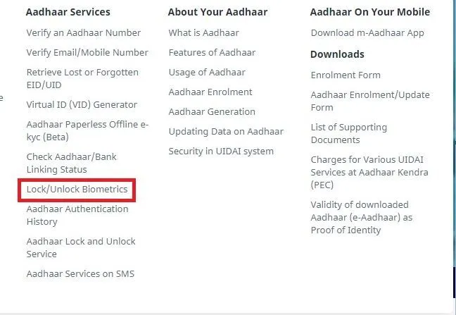 Step 3: Now select the “Lock/Unlock Biometrics” under the Aadhaar Services subhead